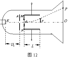 18.(10分)如图12所示为一真空示波管的示意图,电子从灯丝K发出(初速度可忽略不计),经灯丝与A板间的电压U1加速,从A板中心孔沿中心线KO射出,然后进入两块平行金属板M、N形成的偏转电场中(偏转电场可视为匀强电场),电子进入M、N间电场时的速度与电场方向垂直,电子经过电场后打在荧光屏上的P点。 已知M、N两板间的电压为U2,两板间的距离为d,板长为L,电子的质量为m,电荷量为e,不计电子受到的重力及它们之间的相互作用力。