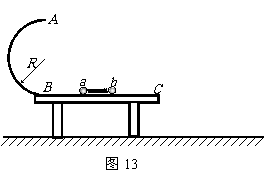 19.(12分)如图13所示,半径为R的光滑半圆环轨道竖直固定在一水平光滑的桌面上,桌距水平地面的高度也为R。在桌面上轻质弹簧被a、b两个小球挤压(小球与弹簧不拴接),处于静止状态。同时释放两个小球,小球a、b与弹簧在水平桌面上分离后,a球从B点滑上光滑半圆环轨道并恰能通过半圆环轨道最高点A,b球则从桌面C点滑出后落到水平地面上,落地点距桌子右侧的水平距离为