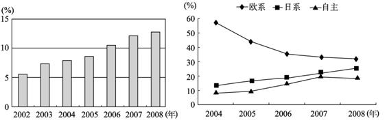 图1中国汽车产量占全球产量比例变化 图2中国自主品牌轿车与欧、日系车市场份额比较