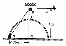 14.(18分)如图所示,竖立在水平面上的光滑半圆形轨道,半径为R=3m,轨道上穿着一质量为m=1kg可视为质点的小球。轨道圆心O的正上方P点固定一可绕水平轴无摩擦转动的定滑轮,P点距水平地面高为4m处,用一条不可伸长的细绳,通过定滑轮对绳的端点A施加一个水平向右的大小F=20N的恒力。不计滑轮大小的影响,g取10m/s2.求: