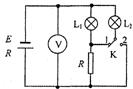 如图所示的电路中,电源电动势为E,内阻为R,L1和L2为相同的灯泡,每个灯泡的电阻和定值电阻相同,阻值均为R,电压表为理想电表,K为单刀双掷开关,当开关由1位置打到2位置时(