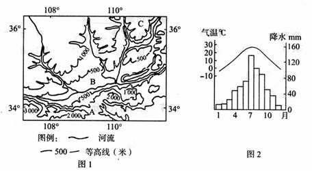 7.读下列某地区地形图(图1)以及图中B点所在地区的气温降水分布图(图2),回答下列问题: