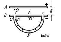 19、(18分)如图所示,A、B为两块平行金属板,A板带正电、B板带负电。两板之间存在着匀强电场,两板间距为d、电势差为U,在B板上开有两个间距为L的小孔。C、D为两块同心半圆形金属板,圆心都在贴近B板的O′处,C带正电、D带负电。两半圆形金属板间的距离很近,两板间的电场强度可认为大小处处相等,方向都指向O′。且两板末端的中心线正对着B板上的小孔。半圆形金属板两端与B板的间隙可忽略不计。现从正对B板小孔紧靠A板的O处由静止释放一个质量为m、电量为q的带正电微粒(微粒的重力不计),问: