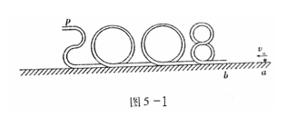 5.(2008山东理综,24,15分)某兴趣小组设计了如图5 – 1所示的玩具轨道,其中“2008”四个等高数字用内壁光滑的薄壁细圆管弯成,固定在竖直平面内(所有数字均由圆或半圆组成,圆半径比细管的内径大得多),底端与水平地面相切,弹射装置将一个小物体(可视为质点)以v0=5m/s的水平初速度由a点弹出,从b点进入轨道,依次经过“8002”后从p点水平抛出。小物体与地面ab段间的动摩擦因数μ=0.3,不计其他机械能损失。已知ab段长L=1.5m,数字“0”的半径R=0.2m,小物体质量m=0.01kg,g=10m/s2。求:
