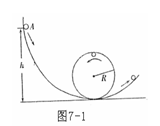 运行过程可以抽象为图7 – 1所示模型。弧形轨道的下端与圆轨道相接,使小球从弧形轨道上端A点静止滑下,进入圆轨道后沿圆轨道运动,最后离开。试分析A点离地面的高度h至少要多大,小球才可以顺利通过圆轨道最高点。(已知圆轨道的半径为R,不考虑摩擦等阻力)