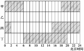 下图为“甲、乙、丙、丁四地12月某日昼夜分布示意图”,阴影表示黑夜。读图回答4--5题。