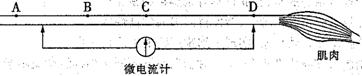 19.为了研究兴奋在神经元轴突上的传导是单向的还是双向的,取新鲜的神经-肌肉标本(实验期间用生理盐水湿润标本),设计了下面的实验装置图(C点位于两电极之间的正中心)。在图中A、B、