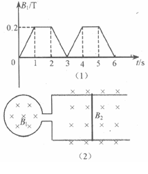 在水平桌面上,一个面积为S的圆形金属框置于匀强磁场中,线框平面与磁场垂直,磁感应强度B1随时间t的变化关系如图⑴所示.0-1 s内磁场方向垂直线框平面向下.圆形金属框与一个水平的平行金属导轨相连接,导轨上放置一根导体棒,导体棒的长为L、电阻为R,且与导轨接触良好,导体棒处于另一匀强磁场中,其磁感应强度恒为B2,方向垂直导轨平面向下,如图⑵所示.若导体棒始终保持静止,则其所受的静摩擦力f随时间变化的图象是下图中的(设向右为静摩擦力的正方向)