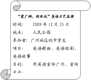 为迎接2010年广州亚运会,广州市举办了一场英语才艺展示活动(English talent