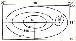 2.D.[解析]图中瀑布位于②支流处,其相对高度范围为[100,200),故选D。 如图表示5000m海拔某时等压线(单位:hPa)分布状况,据图回答3-4题。