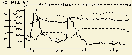 11.A。[解析]天山北坡为迎风坡,降水多;且为阴坡,蒸发小,故湿度大,有利于植被生长。 下图是106.5ºE的地形剖面及相关气候资料图,据图判断12-15题。