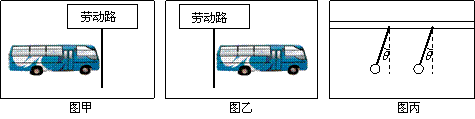 如图甲、乙所示,是一辆质量为6×103kg的公共汽车在t=0和t=3s末两个时刻的两张照片.当t=0时,汽车刚启动,在这段时间内汽车的运动可看成匀加速直线运动.图丙是车内横杆上悬挂的拉手环经放大后的图像,q=37°,根据题中提供的信息,可以估算出的物理量有