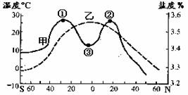 A.甲曲线代表温度,乙曲线代表盐 B.①②处成峰值的原因是降水丰富
