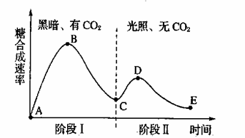 (一) 某科学家设计了一个光合作用的实验。实验前,他向一个密闭容器的溶液中加进了一定量的ATP、NADPH、磷酸盐、光合色素及有关的酶等,然后按图示的条件进行Ⅰ、Ⅱ两个阶段的实验,并绘制了相关的曲线图。请分析回答: