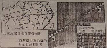 2009年7月22日,本世纪最壮观的日全食自西向东扫过我国的长江流域,从初亏到复圆,持续两个多小时。读长江流域的日全食带分布图和上海某摄影家采取多次曝光技术拍摄的日全食过程照片,回答3-5题。