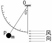 (12分)如图所示,是一种测定风力的仪器,P是质量为200g的金属球,固定在一根细长钢性的金属丝下端,当无风时金属球自然竖直下垂,有风时金属丝将偏离竖直方向,刻度盘上的角度就能反映出风力的大小。若某一时刻风从图示的水平方向吹向金属球P时,金属丝向左偏离竖直的角度θ=30°而处于静止。则(1)此时风力和金属丝拉力分别有多大?