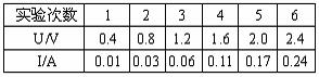 2、 一个研究性学习小组在探究“通过某种导电材料的电流与其两端电压的关系”时,得出电压U和电流I的数据如下表所示。