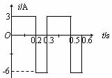 解:该交流周期为T=0.3s,每个周期的前t1=0.2s为恒定电流I1=3A,后t2=0.1s为恒定电流I2= -6A,因此一个周期内电流做的功可以求出来,根据有效值的定义,设有效值为I,根据定义有: