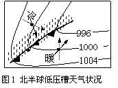 (4)不同地点天气状况分析及对人类活动的影响等,低压中心因气流上升而多阴雨天气,如台风天气;高压中心因气流下沉而天气晴好,如寒潮、伏旱天气;低压槽附近因冷暖气流交汇常伴有阴雨天气(如图1),高压脊控制则为晴朗天气。