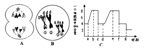 (2)B细胞中染色体①与②的分离发生在C图的 阶段,染色体①上基因D与突变基因d的分离发生在C图的 阶段。