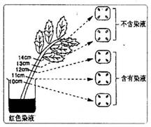34.(9分)以下实验是研究水分在植物体内的移动情况。把洋紫苏的茎放在盛有红色染液的烧杯中,3小时后,把枝条洗净,并在距枝条底部的不同位置切出切片。含有染液的部分显示有水分通过。实验装置和结果如图所示