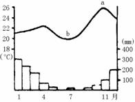 下图表示某地气温(曲线所示)和降水(柱状所示),回答: