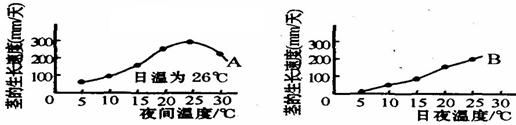 2、在可以调节温度的温室里栽培番茄(自然光下),以研究昼夜温差对番茄生长的影响,实验结果如下图所示。曲线A是根据番茄植株在日温为26℃,夜温如横坐标所示的温度范围测定的数据绘制的;曲线B是根据番茄植株在昼夜恒温(如横坐标所示的温度范围)的情况下测定的数据绘制的。则下列说法正确的是