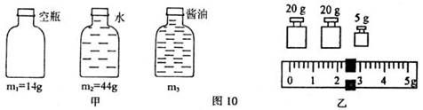 13.(2008四川广安)小刚同学想测酱油的密度,但家里只有天平、小空瓶,而没有量筒。他思考后按照自己设计的实验步骤进行了测量,测量内容及结果如图所示。