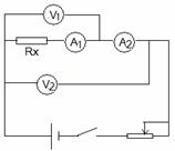 该电路叫做“双重仪表伏安法”,它是传统的伏安法测电阻的改进电路,电路中共用到了4块仪表,其中两块电压表V1、V2完全相同,两块电流表A1、A2完全相同。如果在某次测量中电压表V1、V2的示数分别为U1、U2;电流表A1、A2的示数分别为I1、I2,则: