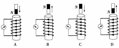 在验证楞次定律的实验中,竖直放置的线圈固定不动,将磁铁从线圈上方插入或拔出,线圈和电流表构成的闭合回路中就会产生感应电流。下列各图中分别标出了磁铁的极性、磁铁相对线圈的运动方向以及线圈中产生的感应电流的方向等情况,其中正确的是