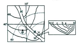 图3实线为地形等高线,虚线为潜水面等高线,等高距均为5米,甲处为一口水井,右侧标注图为“河流MN剖面的等流速线分布图”。读图完成7-8题。