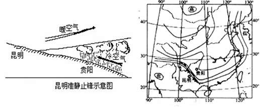 (1)描述昆明准静止锋在贵阳和昆明之间的走向,并说明其形成的季节和成因。(4分)