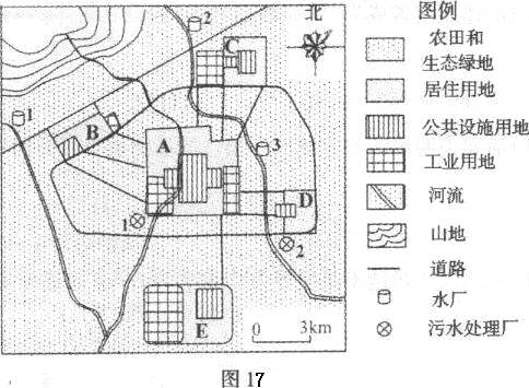 27.(10分)图17为“某城市用地示意图”,该城市A为主城区,兼有B、C、D、E各城区。读图回答下列问题。