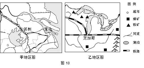 (3)宝山、芝加哥同为世界著名的钢铁工业中心,比较二者在区位因素上的异同。(8分)