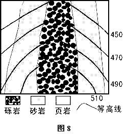 图8中沉积岩的形成符合颗粒大的先沉积,颗粒小的后沉积的规律。图中线段为等高线(单位:米),读图回答15-16题。