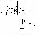 (15分) 如图所示,在磁感强度B= 2T的匀强磁场中,有一个半径r=0.5m的金属圆环。圆环所在的平面与磁感线垂直。OA是一个金属棒,它沿着顺时针方向以20rad/s的角速度绕圆心O匀速转动。A端始终与圆环相接触,OA棒的电阻R=0.1Ω,图中定值电阻R1=100Ω,R2=4.9Ω,电容器的电容C=100pF。圆环和连接导线的电阻忽略不计,求: