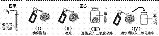 (2)为了探究二氧化碳能与水发生反应生成具有酸性的物质,A、B两同学分别设计了探究实验的方案。A同学的实验方案是将二氧化碳通入紫色石蕊试液中,观察溶液的颜色变化,如图甲所示。B同学的实验方案是取四朵用石蕊试液染成紫色的干燥的小花,按图乙进行实验,观察小花颜色变化(紫色石蕊试液遇酸变红色)。