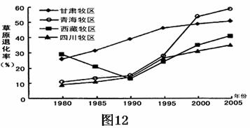 读“我国四个牧区超载起至年份、超载持续时间和年平均超载率表”(表2) 和 “四个牧区草原退化趋势图”(图12),完成25-26题。