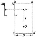 ,磁场方向变化一次.粒子到达P点时出现的磁场方向指向纸外,在Q处有一个静止的中性粒子,P、Q间距离s=3m。PQ直线垂直平分ab、cd.已知D=1.6M,带电粒子的荷质比为1.0×104C/kg,重力忽略不计.求![]()