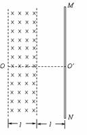 如图所示,MN为一竖直放置足够大的荧光屏,距荧光屏左边l的空间存在着一宽度也为l、方向垂直纸面向里的水平匀强磁场。O′为荧光屏上的一点,OO′与荧光屏垂直,一质量为m、电荷量为q的带正电的粒子(重力不计)以初速度v0从O点沿OO′方向射入磁场区域。粒子离开磁场后打到荧光屏上时,速度方向与竖直方向成30o角。