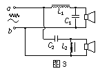 “二分频”音箱内有两个不同口径的扬声器,它们的固有频率分别处于高音、低音频段,分别称为高音扬声器和低音扬声器。音箱要将扩音机送来的含有不同频率的混合音频电流按高、低频段分离出来,送往相应的扬声器,以便使电流所携带的音频信息按原比例还原成高、低频的机械振动。图3为音箱的简化电路图,高、低频混合电流由a、b端输入,L1和L2是线圈,C1和C2是电容器,则下列说法正确的是 ( )