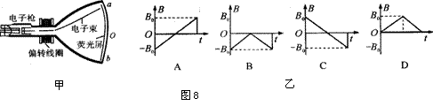 11.如图8甲为显像管的构造示意简图。当没有磁场时电子束将打在荧光屏正中的O点.安装在管径上的偏转线圈可以产生水平方向的磁场,使电子束在竖直方向发生偏转,设垂直纸面向里的磁场方向为正方向,如果要使电子束打在荧光屏上的位置由a点逐渐移动到b点,图乙中哪种变化的磁场能够使电子发生上述偏转 ( )