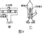 如图9甲所示是日光灯的电路图,它主要是由灯管、镇流器和启动器组成的,镇流器是一个带铁芯的线圈,启动器的构造如图乙所示,为了保护启动器常在启动器的两极并上一纸质电容器C。某教室的一盏日光灯总是出现灯管两端亮而中间不亮的情况,经检查灯管是好的。电压正常,镇流器无故障,其原因可能是 ( )