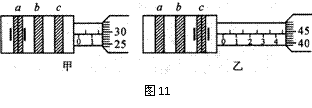 (2)在某次实验中,用某种单色光通过双缝在光屏上得到明暗相间的干涉条纹,其中亮纹a、c的位置利用测量头上的分划板确定,如图11所示。其中表示a纹位置(图甲)的手轮 读数为 mm,c纹位置(图11乙)的手轮读数为 mm。