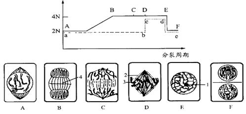 (4) 上图中AB段曲线上升是由于________________,此段相当于分裂图中_______(字母)时期;B→E的变化相当于分裂图中的___________(字母)。
