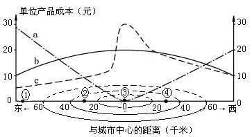 读某工业部门在某城市及其附近地区土地、运输和劳动力等成本曲线图。其中土地成本和运费都只与距城市中心的远近、交通通达度有关,完成16-18题。