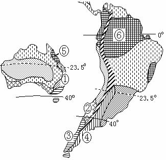 右图是两大洲气候区分布示意图,读图回答下列问题。(12分)