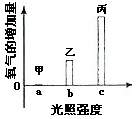 取某种植物生长状态一致的新鲜叶片,用打孔器打出若干圆片,圆片平均分成甲、乙、丙三组,每组各置于一个密闭装置内,并分别给予a、b、c三种不同强度的光照,其他条件一致。照光相同时间后,测得各装置内氧气的增加量如图所示,