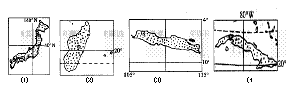 当北京地区座北朝南的房屋内,正午阳光照射面积最大时,下图中各岛正午太阳高度由大到小排列正确的是 ( )