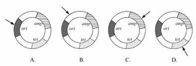 3.下面是四种不同质粒的示意图,其中ori为复制必需的序列,amp为氨苄青霉素抗性基因,tet为四环素抗性基因,箭头表示一种限制性核酸内切酶的酶切位点。若要得到一个能在四环素培养基上生长而不能在氨苄青霉素培养基上生长的含重组DNA的细胞,应选用的质粒是 ( )